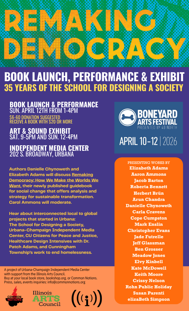 Drawing from race and gender justice, radical education, and experimental art, Remaking Democracy invites participation in creating the abundant worlds we want. It tells the story of a series of interconnected local to global projects that started in Urbana: The School for Designing a Society, Urbana-Champaign Independent Media Center, CU Citizens for Peace and Justice, Healthcare Design Intensives with Dr. Patch Adams, and Cunningham Township’s campaign to end homelessness.