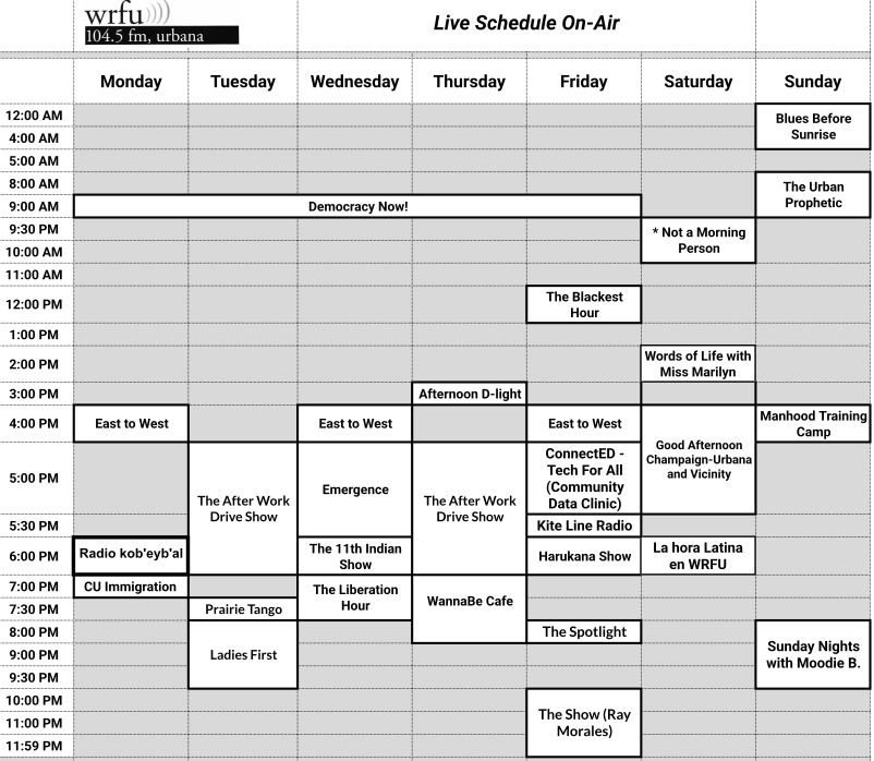 Our programming features an eclectic mix of talk shows and music mixes produced by local, community, and volunteer members of WRFU. Every current show can be streamed online simultaneously as the on-air radio broadcast. Additionally, there is an archive of shows for those who want to explore and listen at a more convenient time.